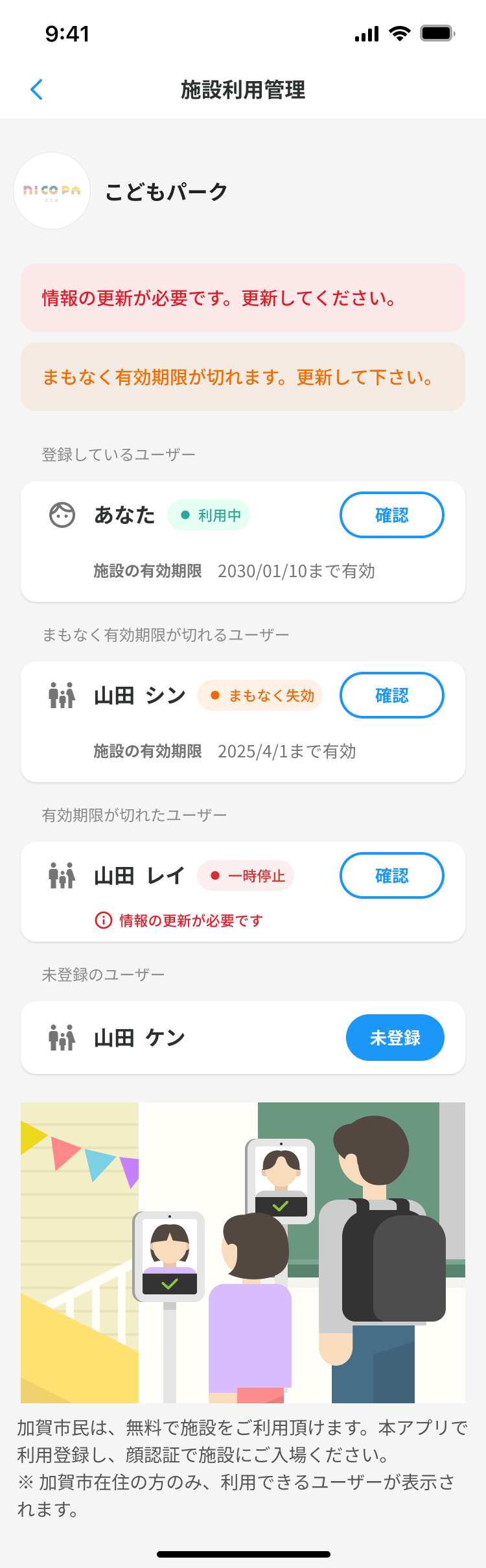> ご登録された利用者の「本人確認記録情報」または「顔情報」の更新日が、1ヶ月後に迫っています。\