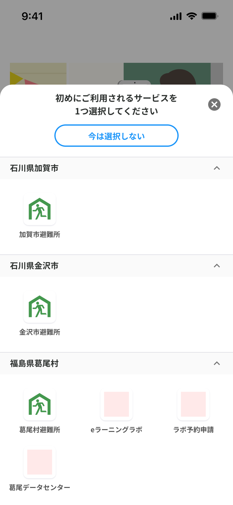ご利用される施設がすでに決まっている場合は、その施設を選択いただき、登録に進んでいただく流れに変更されます。ご利用されたい施設が決まっていない場合は、「今は選択しない」をタップします。
