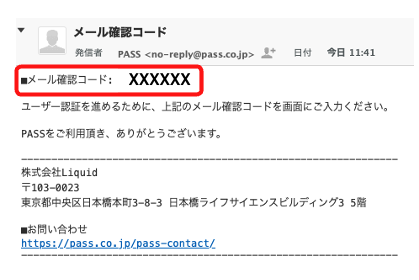 <figure><img src="https://1546087414-files.gitbook.io/~/files/v0/b/gitbook-x-prod.appspot.com/o/spaces%2Fk7XgcuArbHli26A6tBnT%2Fuploads%2F646LOBhMgurBo7839U1r%2Fimage.png?alt=media&#x26;token=62acfd8b-24c2-4343-bb13-cfb284f409ea" alt=""><figcaption><p>登録されているメールアドレスに確認コードが届きます。</p></figcaption></figure>