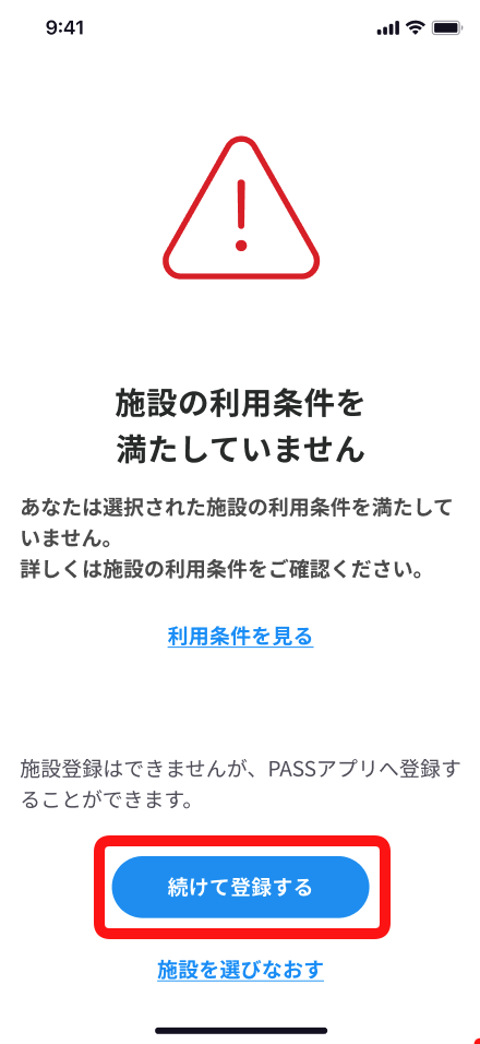 お手数ですが、別の施設を選択し登録しなおしてください。 ※Androidの場合、「とじる」が表示される場合があります。